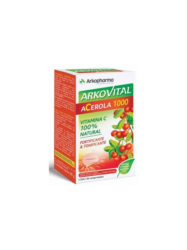 COMPLEMENTO ALIMENTICIO CON EDULCORANTES A BASE DE ZUMO DE BAYA DE ACEROLA PULVERIZADO. ARKOVITAL ACEROLA 1000 ES UN DELICIOSO COMPRIMIDO, SIN VITAMINAS C ARTIFICIAL Y CON UN CONTENIDO DE 100 MG DE ZUMO DE ACEROLA. LA ACEROLA ES UNA PEQUEÑA BAYA, EXCEPCIONALMENTE RICA EN VITAMINA C.LA VITAMINA C AYUDA AREDUCIR EL CANSANCIO Y LA FATIGA Y CONTRIBUYE AL NORMAL FUNCIONAMIENTO DEL SISTEMA INMUNITARIO EN ADULTOS Y NIÑOS