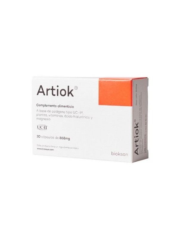 ARTIOK® ES UN COMPLEMENTO ALIMENTICIO QUE CONTIENE COLÁGENO TIPO II (UC-II)® NO DESNATURALIZADO, ÀCIDO HIALURÓNICO, MAGNESIO, CÚRCUMA, BOSWELLIA Y VITAMINAS DEL GRUPO B. EL COLÁGENO ES LA PROTEÍNA MÁS ABUNDANTE DEL ORGANISMO Y SE CARACTERIZA PRINCIPALMENTE POR SU NOTABLE RESISTENCIA. SU PRINCIPAL FUNCIÓN ES FORMAR UNA MATRIZ DE SUSTENTACIÓN PARA ÓRGANOS Y TEJIDOS ADEMÁS DE SER EL RESPONSABLE DE LA FIRMEZA, ELASTICIDAD E INTEGRIDAD DE ESTRUCTURAS COMO LOS TENDONES, ARTICULACIONES Y LIGAMENTOS.TOMAR 1 CÁPSULA AL DÍA.COLÁGENO HIDROLIZADO TIPO UC-II 40 MG, VITAMINA C (ÁCIDO L-ASCÓRBICO) 40 MG (50% VRN), RESINA DE EXTRACTO SECO DE BOSWELLIA SERRATA ROXB 20 MG, RAÍZ DE CÚRCUMA LONGA 10 MG, VITAMINA B6 (CLORHIDRATO DE PIRIDOXINA 82%) 7,3 MG (521% VRN), VITAMINA B1 (CLORHIDRATO DE TIAMINA 79%) 6,07 MG (552% VRN), ÁCIDO HIALURÓNICO 5 MG, VITAMINA B2 (RIBOFLAVINA) 4,2 MG (300% VRN), VITAMINA D (COLECALCIFEROL) 5 MCG (100% VRN), VITAMINA B12 (CIANOCOBALAMINA) 2,5 MCG (100% VRN), MALTODEXTRINA (AGENTE DE CARGA), ESTEARATO DE MAGNESIO (ANTIAGLOMERANTE), DIÓXIDO DE SILICIO (ANTIAGLOMERANTE).LOS COMPLEMENTOS ALIMENTICIOS NO DEBEN UTILIZARSE COMO SUSTITUTOS DE UNA ALIMENTACIÓN VARIADA Y EQUILIBRADA Y UN MODO DE VIDA SANO.NO SUPERAR LA DOSIS DIARIA EXPRESAMENTE RECOMENDADA.MANTENER FUERA DEL ALCANCE DE LOS NIÑOS MÁS PEQUEÑOS.CONSERVAR EN UN LUGAR FRESCO, SECO Y PROTEGIDO DE FUENTES DE CALOR.