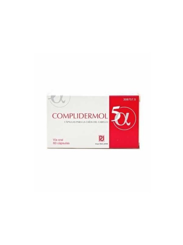 COMPLIDERMOL 5 ALFA ES UN COMPLEMENTO ALÍMENTICIO DISEÑADO PARA LA CAÍDA DEL CABELLO FEMENINA. CON EXTRACTO LÍPIDICO DE PYGEUM AFRICANUM Y SABAL SERRULATA. INHIBIE LA 5-ALFA REDUCTASA, Y ASI INTERVIENE EN LA CAÍDA DEL CABELLO. LA CAJA CONTIENE 60 CÁPSULAS, TRATAMIENTO APROXIMADAMENTE PARA UN MES. CONTIENE TAMBIEN ISOFLAVONAS DE SOJA QUE BLOQUEAN LOS EFECTOS DE LA DIHIDROTESTOSTERONA Y ESTIMULA EL CRECIMIENTO CAPILAR. MANTIENE LA ESTRUCTURA DEL CABELLO, MEJORANDO SU ASPECTO.ADVERTENCIASNO SUPERAR LA DOSISNO USAR EN PERIODOS DE LACTANCIA NI MUJERES EMBARAZADASCONTIENE SOJANO RECOMENDADO EN TRANSTORNOS DE LA ABSORCIÓN O ELIMINACIÓN DE CISTINA