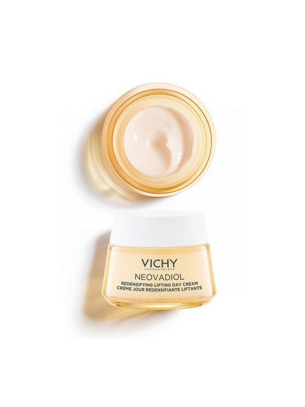 EN LA PERI-MENOPAUSIA, LAS VARIACIONES HORMONALES ACELERAN LOS SIGNOS DEL ENVEJECIMIENTO Y SECAN LA PIEL, QUIETÁNDOLE LA ELASTICIDAD Y FIRMEZA NATURAL. LA DENSIDAD Y DEFINICIÓN DEL CONTORNO FACIAL SON OTRAS DE LAS CAUSAS DEL ENVEJECIMIENTO Y, QUE A NIVEL VISUAL, AFECTAN MUCHO A LA PIEL, PROVOCANDO UNA APARIENCIA CANSADA Y MARCADA POR ARRUGAS.MEJORA EL ASPECTO DE TU PIEL GRACIAS A LA CREMA DE DÍA REAFIRMANTE Y REDENSIFICANTE PARA PIELES SECAS, GRACIAS A SU COMPOSICIÓN CON ÁCIDO HIALURÓNICO QUE RELLENA LAS ARRUGAS, PROXYLANE Y EXTRACTO DE CASSIA QUE MEJORA VISIBLEMENTE LOS SIGNOS DE ENVEJECIMIENTO PROVOCADOS POR LOS CAMBIOS HORMONALES.MECANISMOS ANTIEDAD EN NEOVADIOL CREMA REAFIRMANTEUNA POTENTE COMBINACIÓN QUE HIDRATA HASTA LAS PIELES MÁS SECAS Y MEJORA LA DENSIDAD QUE LAS HORMONAS PROVOCADAS EN TU ROSTRO POR LA MENOPAUSIA.DESCUBRE ESTA POTENTE CREMA QUE NO SOLO MEJORÁ LA APARIENCIA DE TU PIEL, SINO QUE ADEMÁS ALIVIARÁ ESA MOLESTA SENSACIÓN DE PIEL SECA Y SIN BRILLO.NEOVADIOL CREMA DE DÍA REAFIRMANTE Y REDENSIFICANTE REACTIVA LOS MECANISMOS DE LA PIEL: ELASTICIDAD, FIRMEZA, SEQUEDAD.LA EFICACIA ES NUESTRA PRIORIDAD EN VICHY Y, POR ESO, LAS FÓRMULAS HAN SIDO CLÍNICAMENTE PUNTUADAS POR DERMATÓLOGOS EN MUJERES CON PIEL SENSIBLE DURANTE LA MENOPAUSIA. APLICACIÓNAPLICAR POR LA MAÑANA EN EL ROSTRO, LA MANDÍBULA Y EL CUELLO, EVITANDO EL CONTORNO DE LOS OJOS. COMPOSICIÓN AQUA /WATER / EAU - PRUNUS ARMENIACA KERNEL OIL / APRICOT KERNEL OIL - DIMETHICONE - GLYCERIN - HYDROXYPROPYL TETRAHYDROPYRANTRIOL - ZEA MAYS STARCH / CORN STARCH - ALCOHOL DENAT - PROPANEDIOL - PROPYLENE GLYCOL - STEARICACID - ORYZA SATIVA BRAN OIL / RICE BRAN OIL - BUTYROSPERMUM PARKII BUTTER / SHEA BUTTER - ISOHEXADECANE - PALMITIC ACID - PEG-100 STEARATE - PEG-20 STEARATE - STEARYL ALCOHOL - GLYCERYL STEARATE - CERAALBA / BEESWAX / CIRE DABEILLE - HYDROXYETHYLPIPERAZINE ETHANE SULFONIC ACID - CI 15985 / YELLOW 6 - CI 77891 / TITANIUM DIOXIDE - SORBITAN OLEATE - NIACINAMIDE - DIMETHICONOL - MYRISTIC ACID - SODIUM HYALURONATE - ADENOSINE - CAPRYLYL GLYCOL - CAPRYLOYL SALICYLIC ACID - CITRIC ACID - CASSIA ANGUSTIFOLIA SEED POLYSACCHARIDE - TRISODIUM ETHYLENEDIAMINE DISUCCINATE - SYNTHETIC FLUORPHLOGOPITE - PENTAERYTHRITYL TETRA-DI-T-BUTYL HYDROXYHYDROCINNAMATE - ACRYLAMIDE/SODIUM ACRYLOYLDIMETHYLTAURATE COPOLYMER - POLYSORBATE 80 - PARFUM / FRAGRANCE.