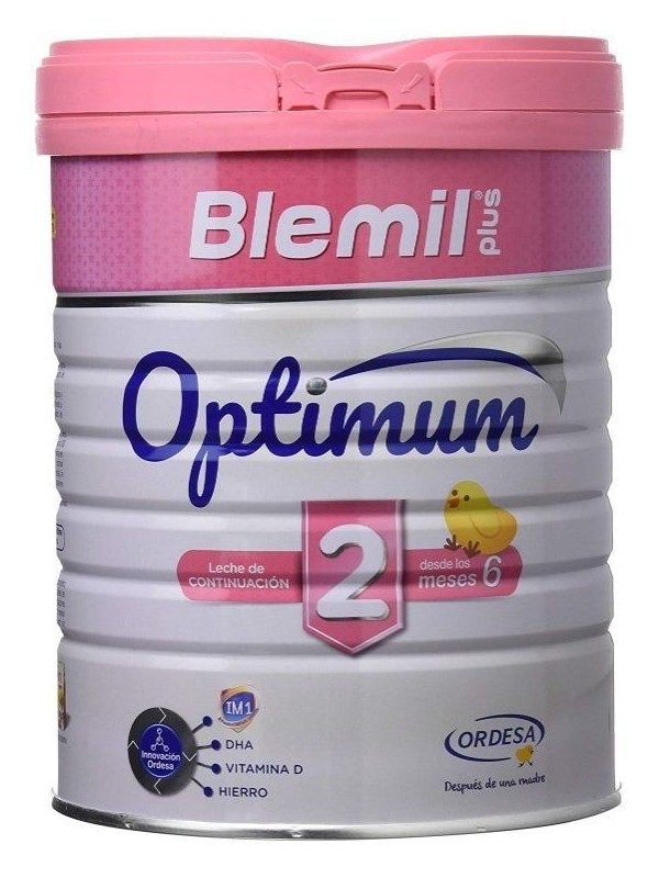 BLEMIL PLUS 2 OPTIMUM:LECHE DE CONTINUACIÓN.INGREDIENTES LACTOSA, LECHE DESNATADA, GRASA LÁCTEA, MALTODEXTRINA, ACEITES VEGETALES (ACEITE DE GIRASOL, ACEITE DE NABINA, ACEITE DE GIRASOL ALTO OLÉICO), GALACTOOLIGOSACÁRIDOS, PROTEÍNAS SÉRICAS, SALES MINERALES (FOSFATO MONOCÁLCICO, CITRATO TRIPOTÁSICO, CITRATO TRISÓDICO, CLORURO CÁLCICO, HIDRÓXIDO POTÁSICO, CITRATO DE MAGNESIO, HIDRÓXIDO CÁLCICO, BISGLICINATO DE HIERRO, SULFATO DE CINC, SULFATO DE COBRE, SULFATO DE MANGANESO, YODURO POTÁSICO, SELENITO SÓDICO), INULINA, 2 FUCOSILLACTOSA (2'-FL), ACEITE DE PESCADO (FUENTE DE DHA) (0,6%), CLORURO DE COLINA, VITAMINAS (VITAMINA C, VITAMINA E, NICOTINAMIDA, PANTOTENATO CÁLCICO, VITAMINA B2, VITAMINA B1, VITAMINA B6, VITAMINA A, ÁCIDO FÓLICO, VITAMINA K, BIOTINA, VITAMINA D, VITAMINA B12), INOSITOL, EMULGENTE (LECITINA DE SOJA), TAURINA, NUCLEÓTIDOS (5'-MONOFOSFATO DE CITIDINA DISÓDICO, 5'-MONOFOSFATO DE URIDINA DISÓDICO, 5'-MONOFOSFATO DE ADENOSINA DISÓDICO, 5'-MONOFOSFATO DE INOSINA DISÓDICO, 5'- MONOFOSFATO DE GUANOSINA DISÓDICO), BIFIDOBACTERIAS Y LACTOBACILOS (B. INFANTIS IM1, L. RHAMNOSUS) 1X109 UFC/100G, L-FENILALANINA, ANTIOXIDANTES (PALMITATO DE ASCORBILO, MEZCLA DE TOCOFEROLES), L-CARNITINA, ÁCIDO CÍTRICO. VITAMINAS, MINERALES Y AMINOACIDOS POR 100G: VITAMINAS: VITAMINA A: (RETINOL) 450 MCG VITAMINA D3: (COLECALCIFEROL) 10,5 MCG VITAMINA E: (TOCOFEROL) 15 MG VITAMINA C: (ÁCIDO ASCÓRBICO) 70 MG VITAMINA B1: (TIAMINA) 550 MG VITAMINA B2: (RIBOFLAVINA) 700 MG VITAMINA B3: (NIACINA) 3,4 MG VITAMINA B5 ( ÄCIDO PANTOTÉNICO) 3,5 MG VITAMINA B6: (PIRIDOXINA) 390 MG VITAMINA B9: (ÁCIDO FÓLICO) 125 MCG VITAMINA B12: (CIANOCOBALAMINA) 1 MCG BIOTINA: 15 MCG VITAMINA K: 35 MCG MINERALES: SODIO: 230 MG CALCIO: 615 MG FÓSFORO: 415 MG HIERRO: 9,5 MG POTASIO: 660 MG MAGNESIO: 50 MG COBRE: 390 MCG ZINC: 4 MG MANGANESO: 100 MCG, IODO: 100 MCG CLORO: 440 MG SELENIO: 20 MCG FLÚOR: 275 MCG OTROS: INOSITOL: 100 MG L-CARNITINA: 9 MG TAURINA:35 MG COLINA: 150 MG MODO DE EMPLEO PREPARACIÓN DEL BIBERÓN: 1) LÁVARSE LAS MANOS ANTES DE PREPARAR EL BIBERÓN. 2) UNA VEZ LIMPIOS EL BIBERÓN, LA TETINA Y LA ROSCA DÉJALOS HERVIR CON AGUA EN UN RECIPIENTE CERRADO DURANTE 10 MINUTOS. 3) EN OTRO RECIPIENTE HERVIR AGUA POTABLE Y DÉJARLA ENFRIAR HASTA UNA TEMPERATURA DE 40 Ó 45 °C. VERTER LA CANTIDAD ADECUADA DE AGUA EN EL BIBERÓN ESTERILIZADO. 4) AÑADIR AL BIBERÓN LAS MEDIDAS RASAS DE LECHE EN POLVO INDICADAS EN LA TABLA DE DOSIFICACIÓN. UTILIZAR EL CACITO DOSIFICADOR QUE SE ENCUENTRA EN EL INTERIOR DEL ENVASE. 5) CERRAR EL BIBERÓN Y AGÍTALO HASTA LA TOTAL DISOLUCIÓN DE SU CONTENIDO. 6) COMPROBAR LA TEMPERATURA DEL BIBERÓN ANTES DE DÁRSELO AL BEBÉ.