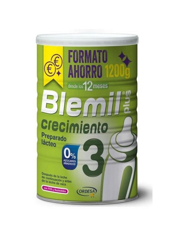 BLEMIL PLUS 3 CRECIMIENTO ES UNA LECHE DE ELEVADO VALOR NUTRICIONAL RECOMENDADA PARA LA TRANSICIÓN ENTRE LA LECHE DE CONTINUACIÓN Y LA LECHE DE VACA. SU FÓRMULA PROPORCIONA AL BEBÉ LOS NUTRIENTES NECESARIOS PARA SU CORRECTO CRECIMIENTO Y DESARROLLO FÍSICO E INTELECTUAL. CONTIENE:CON EFECTO BIFIDUS ES UNA LECHE QUE ESTÁ INDICADA COMO COMPLEMENTO DE LA ALIMENTACIÓN VARIADA DEL NIÑO A PARTIR DE 1 AÑO.INGREDIENTESLECHE DESNATADA, ACEITES VEGETALES (ACEITE DE PALMA, PALMISTE, NABINA, GIRASOL Y GIRASOL ALTO OLÉICO CON FUENTE DE AA), SACAROSA, MALTODEXTRINA, FRUCTOOLIGOSACÁRIDOS, MIEL, SALES MINERALES DE (SODIO, POTASIO, CLORO, CALCIO, FÓSFORO, MAGNESIO, HIERRO, CINC, COBRE, MANGANESO, YODO, SELENIO), AROMA, COMPLEJO VITAMÍNICO (VITAMINAS: C, E, NICOTINAMIDA, PANTOTENATO CÁLCICO, B6, B2, B1, A, K, ÁCIDO FÓLICO, BIOTINA, D, B12), TAURINA, NUCLEÓTIDOS (MONOFOSFATOS DE: CITIDINA, URIDINA DISÓDICA, ADENOSINA, GUANOSINA DISÓDICA, INOSINA DISÓDICA), ANTIOXIDANTES (MEZCLA DE TOCOFEROLES Y PALMITATO DE ASCORBILO), INOSITOL, ACEITE DE PESCADO, L-CARNITINA, LACTOBACILOS Y BIFIDOBACTERIAS (B. INFANTIS Y LRHAMNOSUS). ANÁLISIS MEDIO POR 100 G: PROTEÍNAS: 16 G HIDRATOS DE CARBONO: 54 G - LACTOSA: 29 G - SACAROSA: 13,7 G - MALTODEXTRINA: 8,3 G - MIEL: 3 G LÍPIDOS: 21 G FIBRA ALIMENTARIA: 3 G VITAMINAS, MINERALES Y AMINOACIDOS VITAMINA A (RETINOL): 540 MCG VITAMINA D3 (COLECALCIFEROL): 8 MCG VITAMINA E (TOCOFEROL): 15 MG VITAMINA C (ÁCIDO ASCÓRBICO): 70 MG VITAMINA B1 (TIAMINA): 550 MCG VITAMINA B2 (RIBOFLAVINA): 880 MCG VITAMINA B6 (PIRIDOXINA): 800 MCG VITAMINA B9 (ÁCIDO FÓLICO): 90 MCG VITAMINA B12 (CIANOCOBALAMINA): 2 MCG BIOTINA: 16 MCG VITAMINA PP (NICOTINAMIDA): 5 MG ÁCIDO PANTOTÉNICO: 3,5 MG VITAMINA K: 42 MCG COLINA: 100 MG TAURINA: 35 MG SODIO: 295 MG CALCIO. 790 MG FÓSFORO: 550 MG HIERRO: 8 MG POTASIO: 860 MG MAGNESIO: 69 MG COBRE: 345 MCG CINC: 5 MG MANGANESO: 105 MCG IODO: 70 MCG CLORO: 620 MG INOSITOL: 50 MG L-CARNITINA: 17 MGENERGÍA475 KCAL / 1911 KJMODO DE EMPLEO- PREPARACIÓN DEL BIBERÓN O VASO: 1) LAVE BIEN SUS MANOS Y TODOS LOS UTENSILIOS QUE VA A USAR EN LA PREPARACIÓN DEL BIBERÓN O VASO. 2) UNA VEZ LIMPIOS EL BIBERÓN, LA TETINA Y LA ROSCA DEJARLOS HERVIR CON AGUA EN UN RECIPIENTE CERRADO DURANTE 10 MINUTOS. 3) EN OTRO RECIPIENTE HERVIR AGUA POTABLE Y DEJARLA ENFRIAR HASTA UNA TEMPERATURA DE 40 Ó 45°C. VERTER LA CANTIDAD ADECUADA DE AGUA EN EL BIBERÓN O VASO PREVIAMENTE ESTERILIZADO. 4) AÑADIR AL BIBERÓN O VASO LAS MEDIDAS RASAS DE LECHE EN POLVO INDICADAS EN LA TABLA DE DOSIFICACIÓN. 5) TAPE EL BIBERÓN Y AGITE HASTA QUE EL POLVO SE DISUELVA COMPLETAMENTE. EN CASO DE PREPARAR EL PRODUCTO EN UN VASO REMOVER HASTA QUE EL POLVO SE DISUELVA COMPLETAMENTE. COMPRUEBE LA TEMPERATURA DEL ALIMENTO. CONSERVACIÓN Y CADUCIDADENVASADO EN BOLSA DE ALUMINIO Y ATMÓSFERA PROTECTORA PARA ASEGURAR LA PERFECTA CONSERVACIÓN DEL PRODUCTO Y DE SUS PROPIEDADES ALIMENTICIAS Y NUTRITIVAS. UNA VEZ ABIERTA EL ENVASE, CONSUMIR EN EL PLAZO MÁXIMO DE UN MES. CONSERVA EL ENVASE EN LUGAR FRESCO Y SECO. SIGUIENDO ESTAS INSTRUCCIONES GARANTIZAS LA SALUD Y BIENESTAR DE TU BEBÉ. EL ALIMENTO DEBE ADMINISTRARSE AL LACTANTE INMEDIATAMENTE DESPUÉS DE SER PREPARADO.