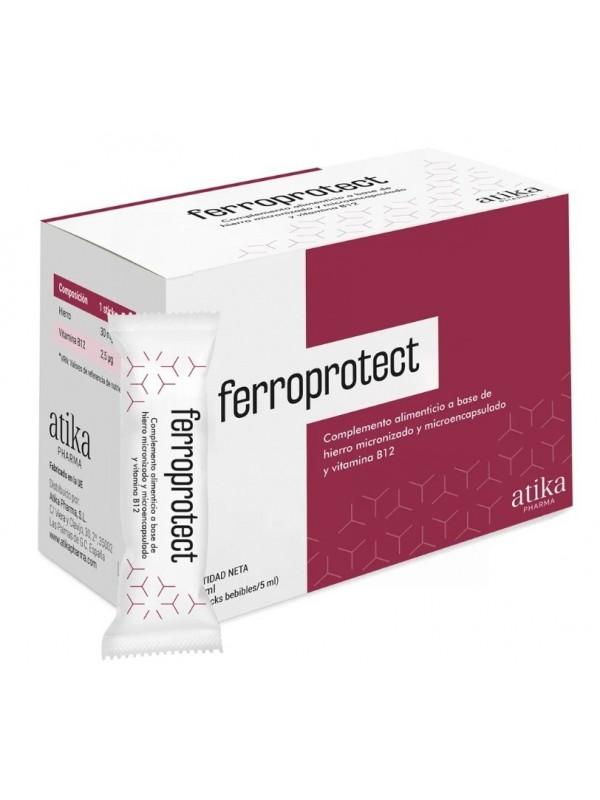 COMPLEMENTO ALIMENTICIO, EN CÓMODOS STICKS BEBIBLES, A BASE DE HIERRO MICRONIZADO Y MICROENCAPSULADO Y VITAMINA B12, CON UNA EXCELENTE ABSORCIÓN Y TOLERANCIA.ES EL ÚNICO HIERRO FORMULADO EN CÓMODOS STICKS BEBIBLES, PARA QUE PUEDAS TOMARLO CUANDO Y DONDE QUIERAS, SIN NECESIDAD DE AGUA.SU EXCELENTE SABOR HA SIDO RECONOCIDO EN PREMIOS INTERNACIONALES. LO DE QUE EL HIERRO SABE A HIERRO YA ES HISTORIA.LA TECNOLOGÍA AVANZADA POR LA QUE EL HIERRO DE FERROPROTECT ES SOMETIDO A UN PROCESO DE MICRONIZADO (SE REDUCE EL TAMAÑO DE PARTÍCULA) Y MICROENCAPSULADO (LAS PARTÍCULAS SE INTRODUCEN DENTRO DE UNAS ESFERAS MICROSCÓPICAS FORMADAS POR ÁCIDOS GRASOS) HACE QUE TENGA:ÓPTIMA TOLERABILIDAD GASTROINTESTINALMAYOR ABSORCIÓNCLÍNICAMENTE TESTADOAPTO PARA:EMBARAZADAS,VEGANOS NO CONTIENE LÁCTEOS, SIN GLUTEN , SIN HUEVO Y COMPATIBLE CON LA DIETA HALAL.SITUACIONES QUE PUEDEN REQUERIR UN APORTE EXTRA DE HIERROEL HIERRO ES UN MINERAL FUNDAMENTAL PARA EL CORRECTO FUNCIONAMIENTO DE NUESTRO ORGANISMO, LO PODEMOS OBTENER A PARTIR DE NUESTRA DIETA. SIN EMBARGO, HAY UNA SERIE DE SITUACIONES QUE REQUIERAN QUE TENGAMOS QUE RECIBIR UN APORTE EXTRA DE HIERRO:APORTE INSUFICIENTE DE HIERRO EN LA DIETA:DIETAS VEGANAS/VEGETARIANAS.DIETAS HIPOCALÓRICAS/CONTROL PESO.AUMENTO DE LA DEMANDO DE HIERRO:EMBARAZO. ETAPAS DE CRECIMIENTO.MALABSORCIÓNATROFIA DE LA MUCOSA DIGESTIVA (ENFERMEDAD INFLAMATORIA INTESTINAL, CELIAQUÍA, HELICOBACTER, ETC).DISMINUCIÓN DE LAS SECRECIONES ÁCIDAS ESTOMACALES.OBESIDAD, CIRUGÍA BARIÁTRICAPÉRDIDA DE HIERRO:MENSTRUACIÓN CON SANGRADA INTENSO O PROLONGADO (MENORRAGIA) O MÁS FRECUENTE (POLIMENORREA).SANGRADOS DIGESTIVOS(ÚLCERAS, PÓLIPOS,PARÁSITOS,ETC).CÁNCER.DONACIONES DE SANGRE.FERROPROTECT CONTRIBUYE A:LA FORMACIÓN NORMAL DE GLÓBULOS ROJOS Y DE HEMOGLOBINA, AL TRANSPORTE NORMAL DE OXÍGENO EN EL CUERPO Y A DISMINUIR EL CANSANCIO Y LA FATIGA.MANTENER UNA FUNCIÓN NORMAL DEL SISTEMA INMUNITARIO, DEL SISTEMA NERVIOSO Y A MANTENER UNA FUNCIÓN COGNITIVA NORMAL ENTRE OTRAS FUNCIONES FISIOLÓGICAS.