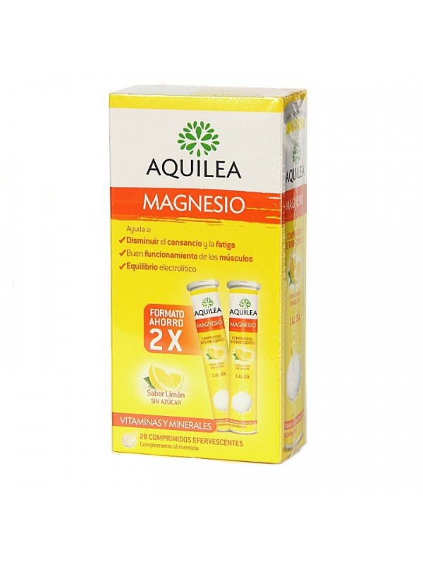 AQUILEA MAGNESIO:- COMPRIMIDO EFERVESCENTE.- SABOR A LIMÓN.- INDICADO PARA PERSONAS QUE ESTÉN PASANDO POR PERIODOS DE SOBREESFUERZO O DECAIMIENTO Y DEBILIDAD O PERSONAS QUE QUIERA EVITAR LA APARICIÓN DE CALAMBRES.- APTO PARA CELÍACOS.- SIN LACTOSA.- SIN AZÚCAR AÑADIDO.INGREDIENTESMAGNESIO 375 MG (100% VRN*) EN FORMA DE 1.000MG DE BISGLICINATO DE MAGNESIO, 700MG DE CARBONATO DE MAGNESIO Y 176MG DE ÓXIDO DE MAGNESIO.LOS COMPLEMENTOS ALIMENTICIOS NO DEBEN UTILIZARSE COMO SUSTITUTOS DE UNA DIETA VARIADA Y EQUILIBRADA Y DE UN MODO DE VIDA SANO. NO SOBREPASAR LA CANTIDAD DIARIA RECOMENDADA. CONSERVAR EN LUGAR FRESCO Y SECO, PROTEGIDO DE LA LUZ SOLAR. MANTENER FUERA DEL ALCANCE DE LOS NIÑOS MÁS PEQUEÑOS.