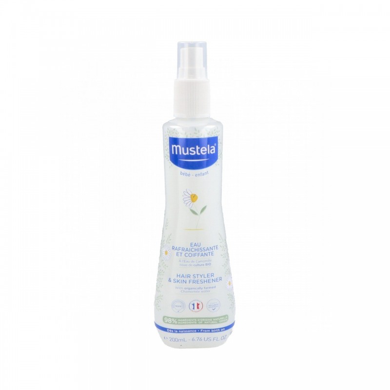 La Agua para Peinar Refrescante de Mustela es un spray multifunción formulado con camomila BIO, ideal para cuidar el cabello y la piel de los más pequeños. Su fórmula natural y sin alcohol permite usarla desde el nacimiento, aportando un aroma delicado y una sensación de frescor inmediata.