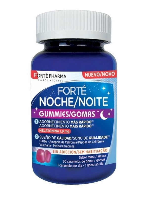 FORTÉ NOCHE GUMMIES ES UN COMPLEMENTO ALIMENTICIO CON UN DOBLE EFECTO:1. GRACIAS A LA MELATONINA EN ALTA DOSIS (1,9 MG) CONTRIBUYE A DISMINUIR EL TIEMPO NECESARIO PARA CONCILIAR EL SUEÑO(1).2. LA AMAPOLA DE CALIFORNIA AYUDA A REDUCIR LOS DESPERTARES NOCTURNOS Y FAVORECE EL SUEÑO(2).LA FÓRMULA SE COMPLEMENTA CON EL NEUROMEDIADOR GABA (ÁCIDO GAMAAMINOBUTÍRICO) NATURALMENTE PRESENTE EN EL ORGANISMO Y CON LA VALERIANA, MELISA Y TILA. UN FORMATO PRÁCTICO, NO NECESITA AGUA, CON AGRADABLE SABORNA MORA.ALEGACIONES:(1)LA MELATONINA CONTRIBUYE A DISMINUIR EL TIEMPO NECESARIO PARA CONCILIAR EL SUEÑO CON UN CONSUMO DE 1 MG (1000 ΜG) DE MELATONINA ANTES DE IRSE A DORMIR.(2)LA AMAPOLA DE CALIFORNIA MEJORA LA CALIDAD DEL SUEÑO.SIN GLUTEN. SIN LACTOSA. SIN HUEVO. SIN SOJA. SIN FENILALANINA. SIN AZÚCARES AÑADIDOS.TOMAR MÁXIMO 1 CARAMELO DE GOMA AL DÍA, POR LA NOCHE, MEDIA HORA ANTES DE ACOSTARSE.INGREDIENTES (POR DOSIS DIARIA): FRUCTOOLIGOSACÁRIDOS, AGUA, AGENTE GELIFICANTE (PECTINA), EXTRACTO DE AMAPOLA DE CALIFORNIA (ESCHSCHOLZIA CALIFORNICA CHAM.) (50 MG O 150 MG EQUIVALENTE EN PLANTA), ACIDIFICANTE (ÁCIDO CÍTRICO), EXTRACTO DE VALERIANA (VALERIANA OFFICINALIS L.) (25 MG O 75 MG EQUIVALENTE EN PLANTA), ÁCIDO GAMMA-AMINOBUTÍRICO (20 MG), EXTRACTO DE MELISA (MELISSA OFFICINALIS L.) (40 MG EQUIVALENTE EN PLANTA), EXTRACTO DE TILA DE HOJA PEQUEÑA (TILIA CORDATA MILL.) (40 MG EQUIVALENTE EN PLANTA), COLORANTE (ANTOCIANINAS), CORRECTOR DE LA ACIDEZ (CITRATO TRISÓDICO), ACEITE VEGETAL, AROMA NATURAL, MELATONINA (1,9 MG), ANTIAGLOMERANTE (CERA DE CARNAUBA.LOS COMPLEMENTOS ALIMENTICIOS NO DEBEN UTILIZARSE COMO SUSTITUTO DE UNA DIETA VARIADA Y EQUILIBRADA Y UN MODO DE VIDA SALUDABLE. ESTE PRODUCTO DEBE MANTENERSE FUERA DE LA VISTA Y DEL ALCANCE DE LOS NIÑOS. NO SOBREPASE LA DOSIS DIARIA RECOMENDADA. NO SUMINISTRAR EN MUJERES EMBARAZADAS O EN PERIODO DE LACTANCIA NI MENORES DE 12 AÑOS SIN PREVIO AVISO MÉDICO. NO CONDUCIR UN VEHÍCULO O UTILIZAR UNA MÁQUINA DURANTE LAS 4 O 5 HORAS POSTERIORES A LA TOMA DE MELATONINA. ESTE COMPLEMENTO ALIMENTICIO NO ES UN MEDICAMENTO. EN CASO DE TOMA DE MEDICAMENTOS (ANTIDEPRESIVOS, SOMNÍFEROS U OTROS SEDANTES, ETC), NO TOMAR SIN PREVIO AVISO MÉDICO. DESACONSEJADO USO PROLONGADO.AS.