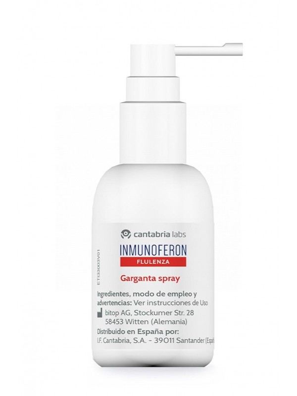 TRATAMIENTO DE LA SEQUEDAD E IRRITACIÓN DE LOS EPITELIOS DE BOCA Y GARGANTA.REDUCE LOS SÍNTOMAS DE FARINGITIS AGUDA Y/O LARINGITIS TALES COMO EL DOLOR DE GARGANTA, RONQUERA, TOS Y DOLOR AL TRAGARCONTRIBUYE A REDUCIR LA INFLAMACIÓN DE LAS MUCOSAS DE BOCA Y GARGANTA.COMPOSICIÓNECTOIN®SAL MARINATAMPÓN FOSFATOACEITE DE MENTAXILITOLAGUAPRECAUCIONESLOS NIÑOS MENORES DE 2 AÑOS NO DEBEN USAR INMUNOFERON FLULENZA GARGANTA SPRAYINMUNOFERON FLULENZA GARGANTA SPRAY NO DEBE USARSE EN CASO DE HIPERSENSIBILIDAD A ECTOIN® O A ALGUNO DE SUS INGREDIENTESEN CASO DE REACCIÓN ALÉRGICA SUSPENDER INMEDIATAMENTE EL USO DE INMUNOFERON FLULENZA GARGANTA SPRAYPARA GARANTIZAR UN USO HIGIÉNICO SEGURO CADA ENVASE DEBE SER USADO POR UNA ÚNICA PERSONANO USAR MÁS DE 3 MESES UNA VEZ ABIERTO EL ENVASEMANTENER INMUNOFERON FLULENZA GARGANTA SPRAY FUERA DEL ALCANCE DE LOS NIÑOSNO USAR SI EL DISPOSITIVO ESTÁ DAÑADO O ABIERTO