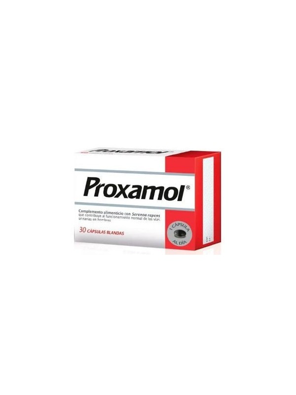 PROXAMOL 30 CAPSULAS BLANDAS PROXAMOL ES UN COMPLEMENTO ALIMENTICIO CON EXTRACTO LIPÍDICO DEL FRUTO DE SERENOA REPENS, QUE CONTRIBUYE AL FUNCIONAMIENTO NORMAL DE LAS VÍAS URINARIAS EN HOMBRES. INGREDIENTES SERENOA REPENS (BARTRAM) SMALL (EXTRACTO LIPÍDICO DEL FRUTO), GELATINA, HUMECTANTE (GLICERINA), AGUA