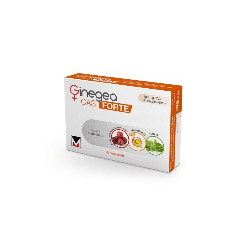 Ginegea CAS FORTE es un complemento alimenticio que contiene vitamina C, extracto de arándano rojo americano con 180 mg de proantocianidinas y extracto de salvia.